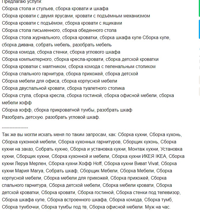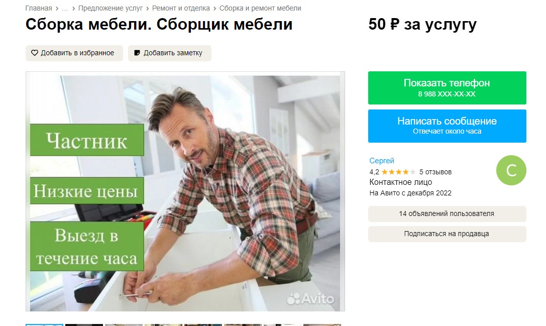 Видно, что даже частные мастера обращаются за профессиональным продвижением услуг, и это работает. Вот карточка мастера-сборщика мебели с сайта объявлений: