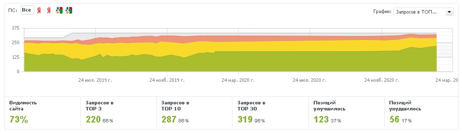 За год сайт увеличил видимость в поисковых системах, получил дополнительный трафик. Сейчас мы продолжаем работу над техническими правками, наращиванием ссылочной массы и продолжаем расти.