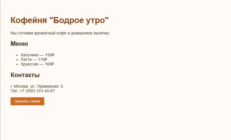 Сделай одностраничный HTML-сайт для кофейни. Пусть будет заголовок, описание, блок меню, контакты и кнопка «Заказать столик». Цвета светлые и тёплый»