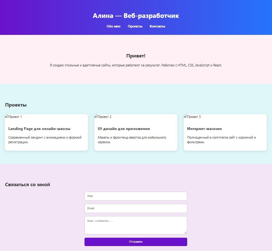«Создай одностраничный HTML-сайт-портфолио с ярким современным дизайном: плавные градиенты, цветные секции, карточки проектов с тенью и hover-анимацией, адаптивная верстка, форма обратной связи. Секции: шапка с навигацией, «Обо мне», «Проекты» (3 карточки), «Контакты» с формой»