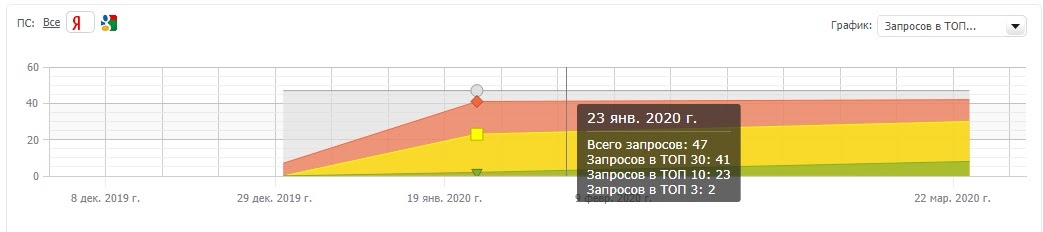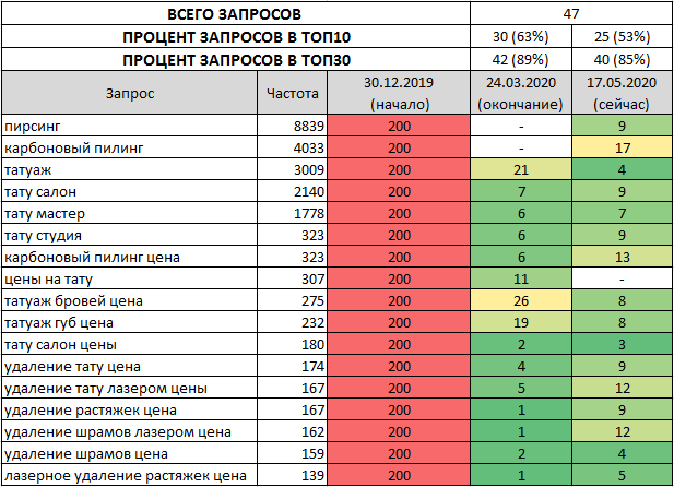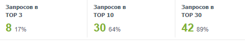 По истечении 3 месяцев более 60% запросов было в ТОП-10