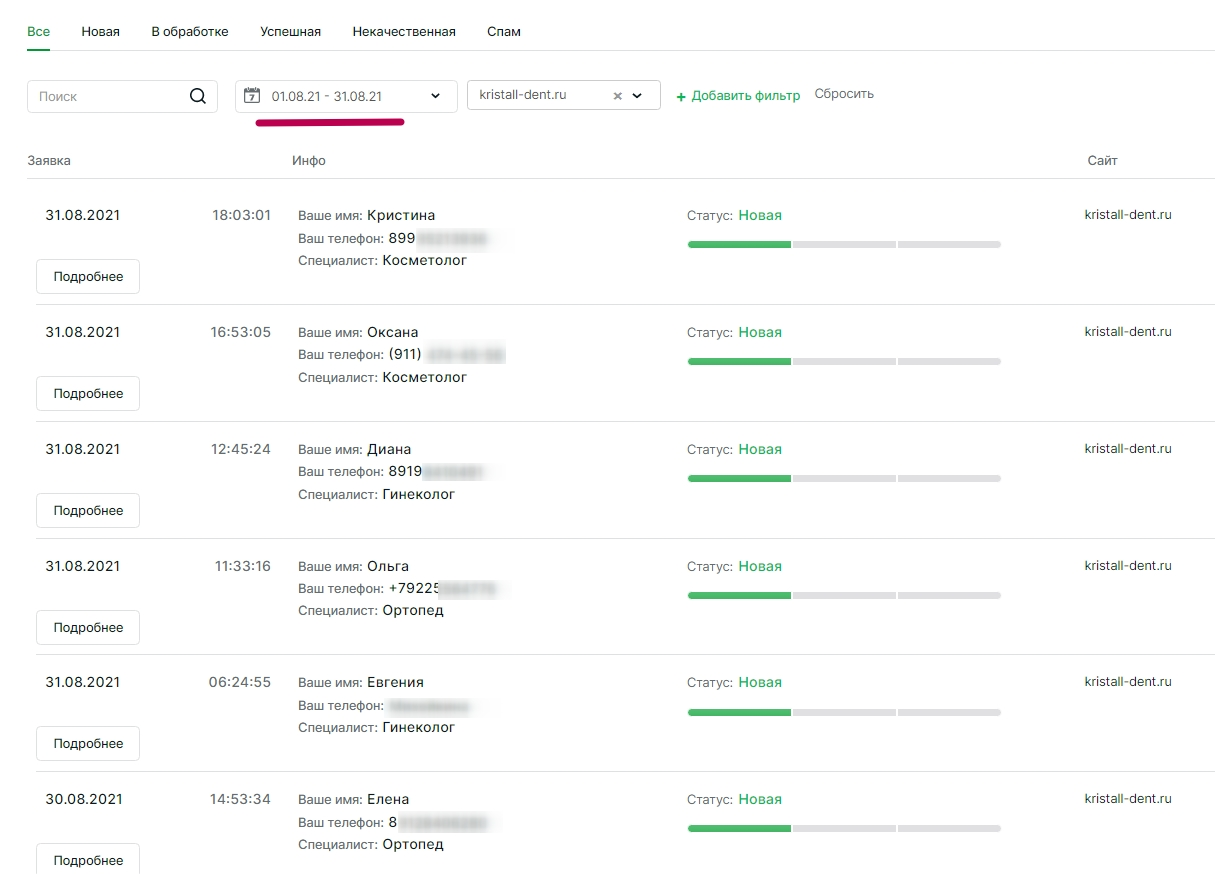 Подробное описание заявок: имя, телефон и необходимый специалист: