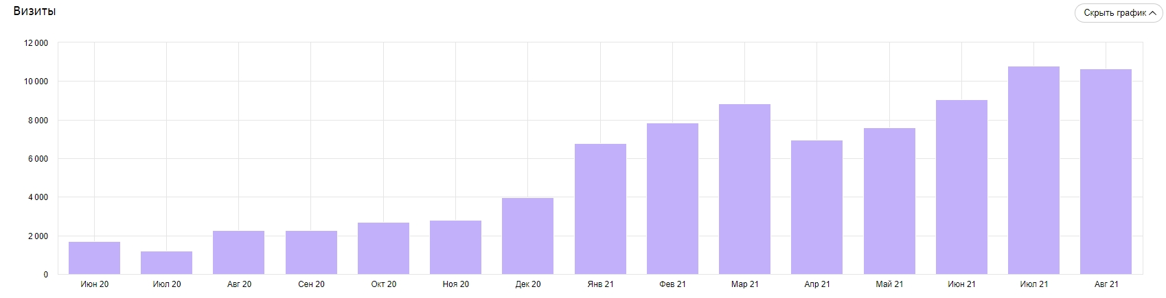 На графике ниже можно заметить рост числа посетителей сайта с 2 000 тысяч человек в месяц до более чем 10 000 посетителей в месяц.