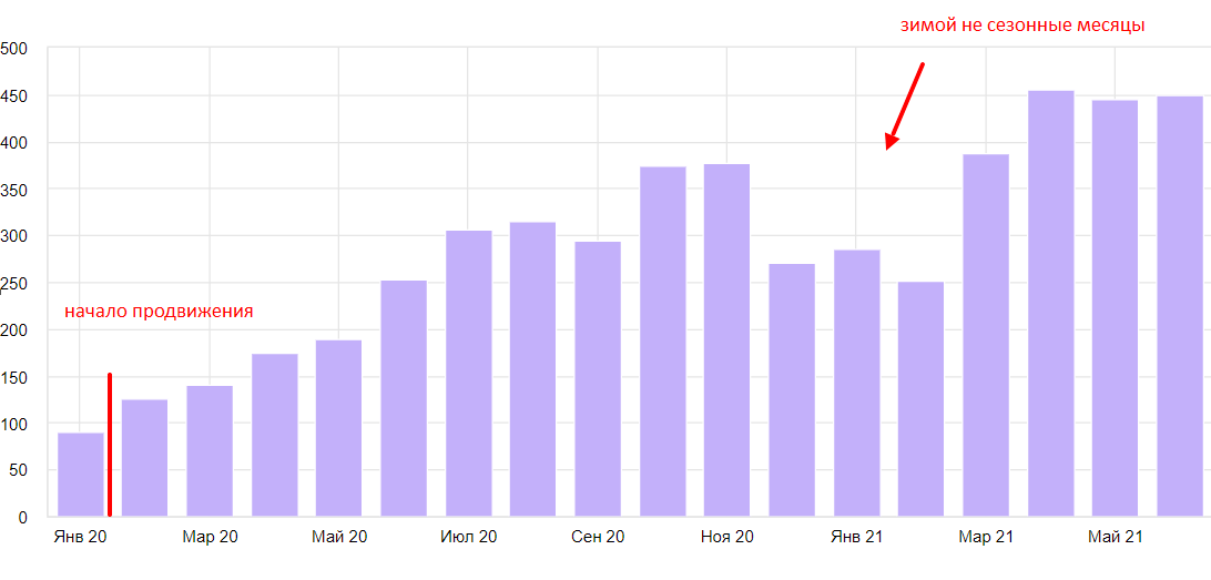 Показатели трафика на всём периоде продвижения растут (с учетом сезонного спроса в зимнее время) и продолжают расти