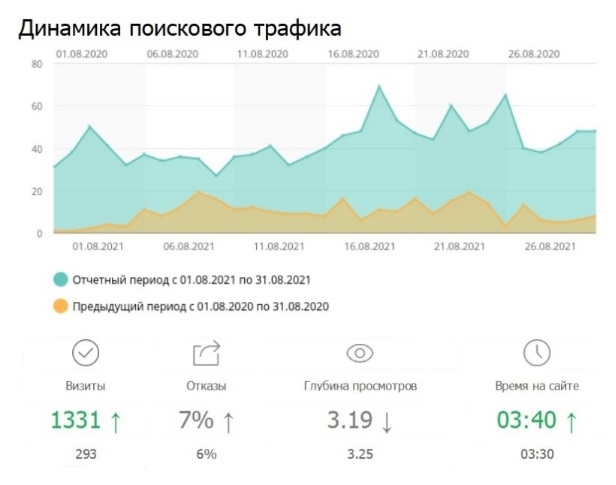 На графиках можно увидеть прогресс по посещаемости и динамику поискового трафика