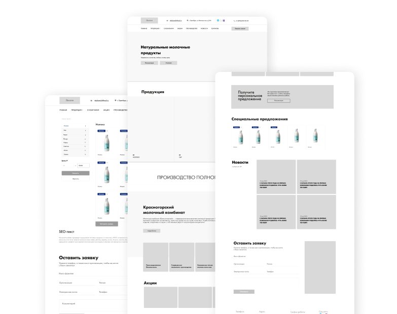 Страница «Продукция» — это каталог, в котором выделили карточки товаров: молоко, творог, сыр, йогурт, кефир, сметана, масло, сливки.