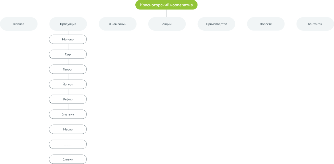 Работу начали с разработки структуры будущего сайта. Важна была каждая деталь, поэтому чтобы не упустить важные моменты, внесли все в майнд-карту. Требовалось подготовить страницы: главную, «Продукция», «О компании», «Акции», «Производство», «Новости», «Контакты».