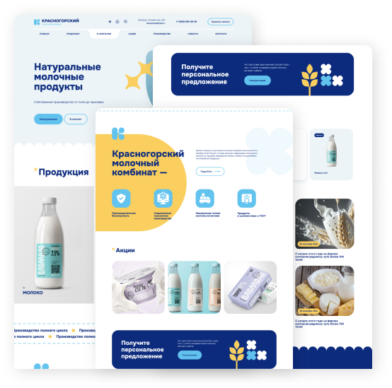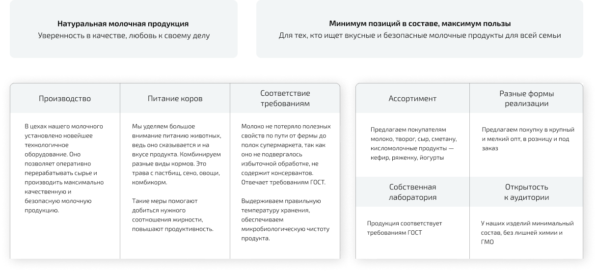 Так как тема производства молочных продуктов привычная, просто текстом сложно заинтересовать. Сделали упор на наглядность: добавили крупные значки, картинки, окна со специальными предложениями. Даже если некогда читать, внимание привлекает графика.