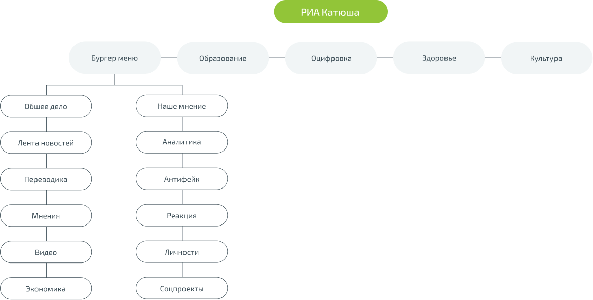 Перед разработкой продумали структуру будущего сайта. Чтобы не упустить детали, все направления зафиксировали в майнд-карте. В ней отметили основные блоки и будущие страницы: