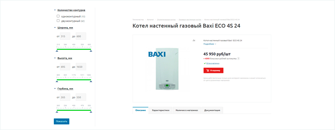 Большую помощь работе с «товаркой» оказал сам «ТеплоМастер» — представитель планомерно заполнял свойства товаров в 1С, чтобы мы могли на их основе настраивать и выводить товарные фильтры.