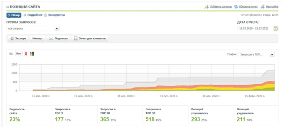 На старте продвижения были собраны все релевантные сайту запросы и сформировано семантическое ядро, на основе которого далее прорабатывался каталог, закупались ссылки