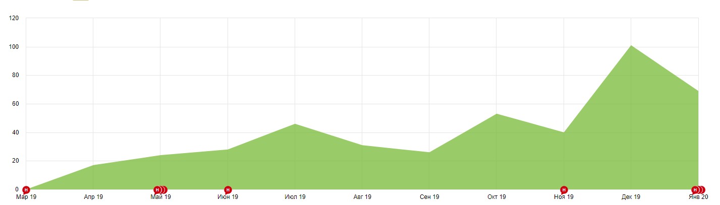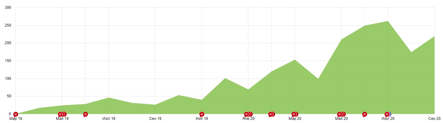 • посещаемость с поисковых систем постепенно выросла: с 50 визитов в январе 2020 года до 200 визитов в сентябре 2020 года. Сейчас (октябрь 2021 года) посещаемость с поисковых систем Яндекс и Google составляет 500 визитов.