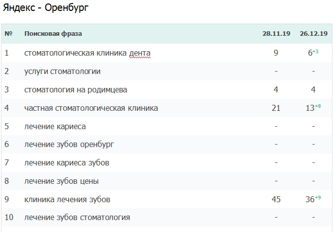 Позиции по первым 10 запросам в Яндексе, декабрь 2019 года