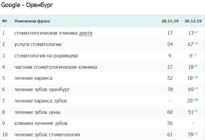 Позиции по первым 10 запросам в Google, декабрь 2019 года