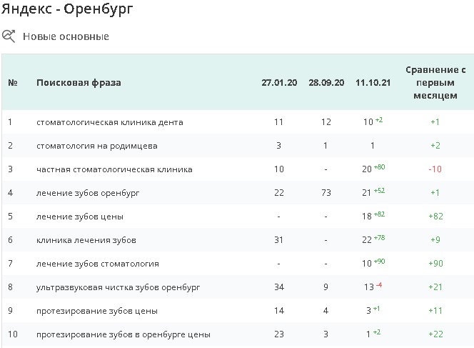 Ряд технических доработок, изменения в структуре посадочных страниц и расширение семантического ядра — позволили значительно увеличить посещаемость сайта и улучшить позиции. Продвижение сайта продолжается. Поставлены новые цели - создание новых посадочных страниц, рост посещаемости и заявок. Отслеживаются высокочастотные запросы, например: “стоматология оренбург”.