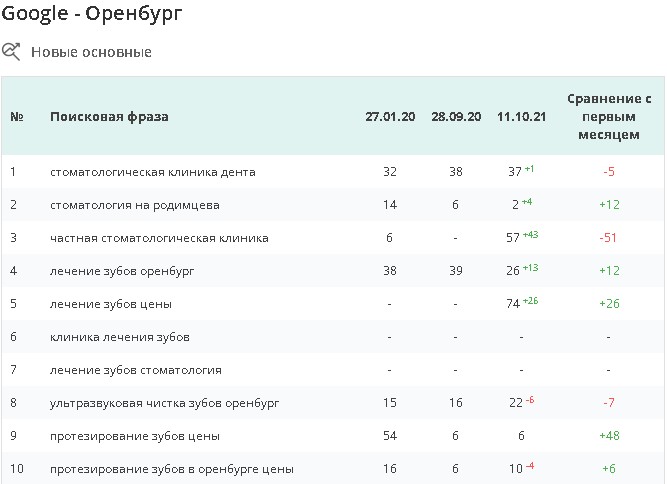 Позиции в Google по первым 10 запросам, сравнение по месяцам