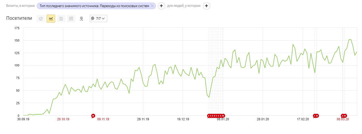 Рост посетителей по дням с 0 до 152 человек в сутки